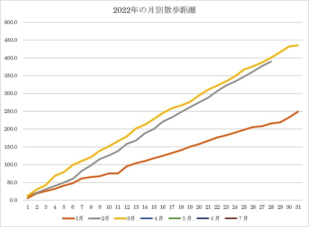 今年の散歩は「前月との競争」をテーマにしています。この目標設定が功を奏したか、2・3月はいい感じで推移しています。