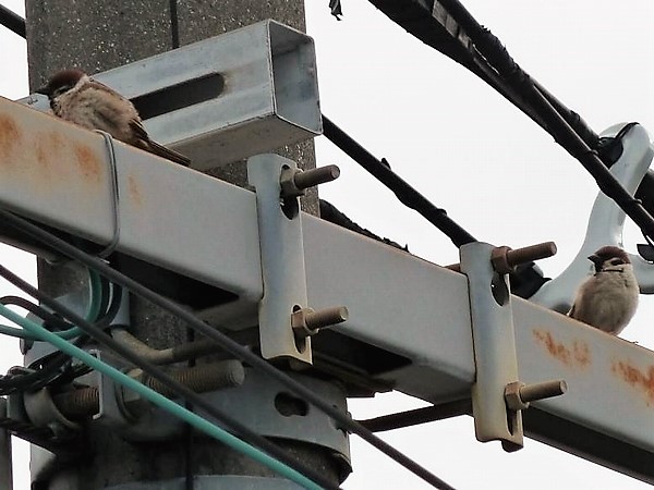 表の電柱の四角パイプの中で毎年雀が子育てしています。二階から少し首を上げるだけで見えます。