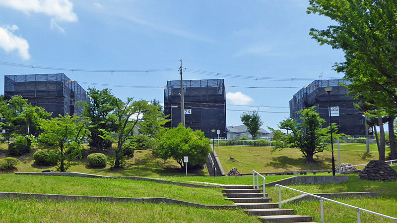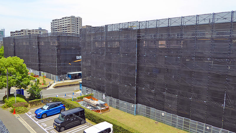 現在10棟以上が黒ネットで覆われ、まるで「黒覆面」をしている様な威圧感を覚えます。未だ足場を組んでいる途中の建物もあり、合計21棟(E6~E26)の修復工事が計画されています。