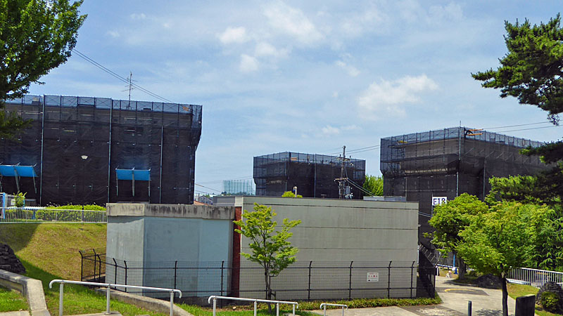 当家近くの香里団地E地区(香里ヶ丘1丁目)にて、大規模な外壁修復工事が開始されています。足場を組み、黒の保護ネットで覆い、約1カ月経過して、やっと外壁や階段室の修復と塗装工事が始まっています。猛暑期を迎え、風通しも悪くなり、居住者の方は何かと大変なことと思われます。