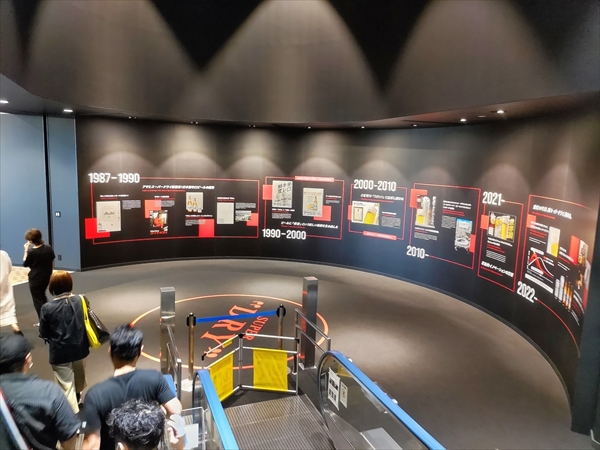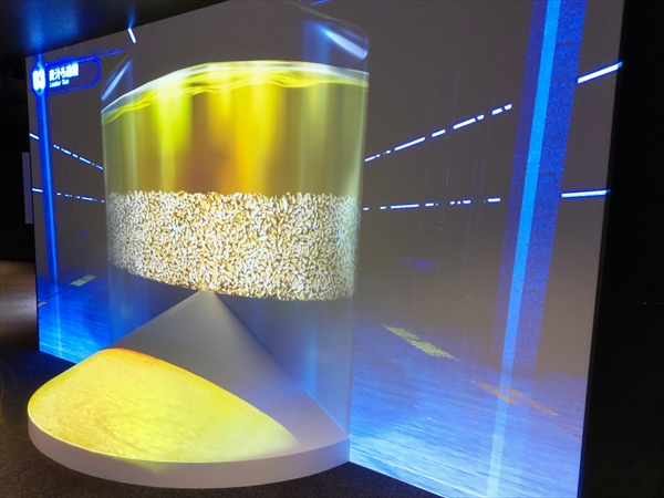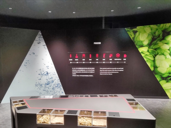 見学時間になるとまずビデオを見ます。その後、工場見学です。通路も黒を基調に赤いラインがきれいに見えます。ビールの材料を紹介コーナーでも、コロナのため触れません。ビールができる説明にも、プロジェクションマッピングでわかりやすくなりました。最後は、ビール缶に乗って、工場を見学する動画が見れます。画像が大きく、変化も激しくジェットコースターに乗っている気分でした。