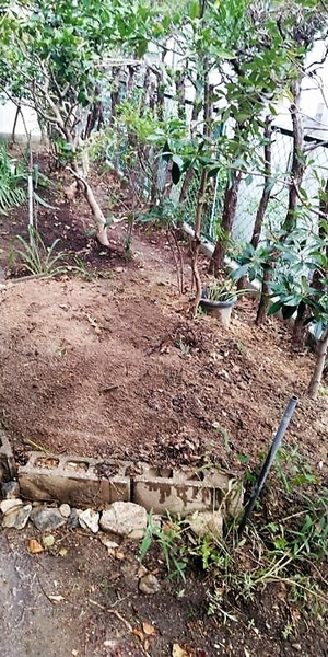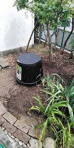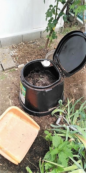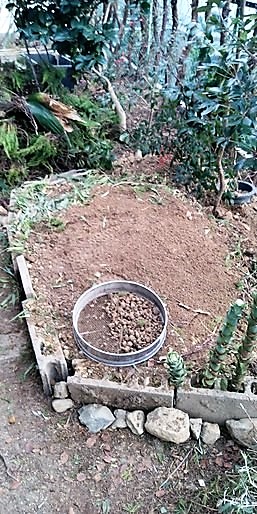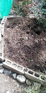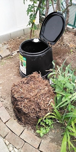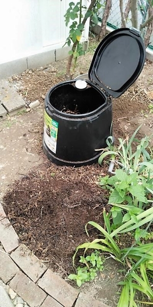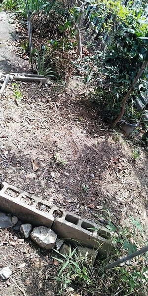 オレンジの箕がある場所が最初のコンポストの位置です。お客様がコンポストに追加投入されていませんでしたので、あえて遠くに移して手前のレンガを敷き直してみました。最初の位置は居間の掃き出しから出来るだけ近い位置に設置して、お客様利便性を優先したものです。