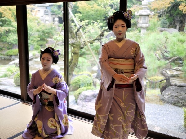 会食懇談のメインは舞妓踊りの鑑賞です。舞妓さんは、お座敷に出てから芸子さんになるまでの、おおむね二十歳までの娘さんに限られていて、衣装や髪型は季節を反映しています。さて、本日は3名の舞妓さんが京情緒あふれるが踊り(夕暮れ・祇園小唄・わしが在所)が披露され、楽しいひと時を過ごすことができました。その後、舞妓さんとのグループごとに撮影会も行われました。