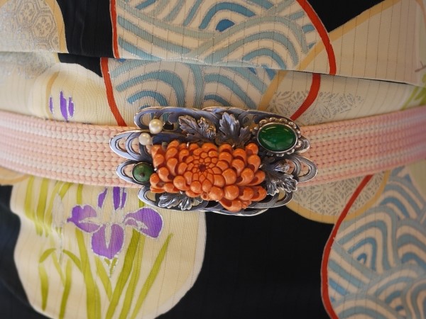 ご存じのとおり、お化粧を白く塗るのは蠟燭の灯りでも顔が見えるようにしたなごりで、日本髪に花かんざし(毎月変わる)を付けます。着物は、振り袖の丈を少し詰め、だらり帯(6.5m)、伝統工芸品 貴重で高価な「ぽっちり(大きなバックルのようなもの)」を着けています。