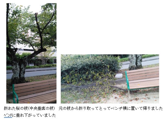 「さくら公園」のさくらの木が、台風14号の通過前日に左の写真「中央付近で真直ぐに伸びている枝」が折れて、下のベンチに垂れ下がっていました。 完全に折ってベンチの横に置いておきました。早朝でしたが市役所には通報済。