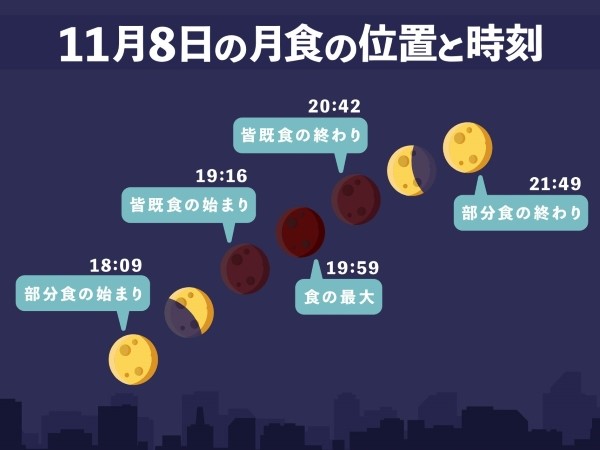 11月8日(火)は、今年最大のダブル天体ショー「皆既月食+天王星食」です。月食中の赤銅色の月に天王星が隠れる「天王食」も同時に楽しむことができ、大阪でも天体観測日和になります。次に皆既月食が観られるのは2025年9月8日で約3年後となります。