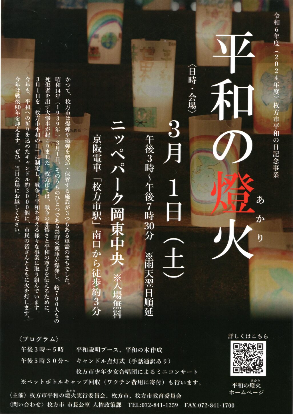 昭和14年3月1日、そのうちのひとつである禁野火薬庫が爆発し、約700人もの死傷者を出す大惨事が起こりました。枚方市では、戦争の悲惨さと平和の尊さを伝えるために、3月1日を「枚方市平和の日」に制定し、戦争と平和を考える様々な事業に取り組んでいます。