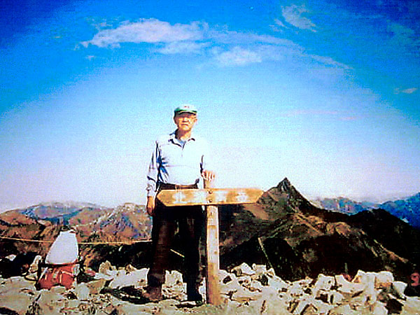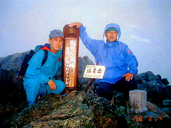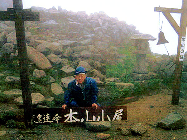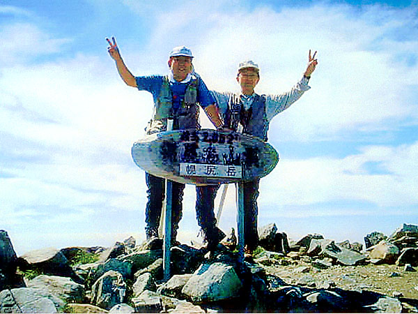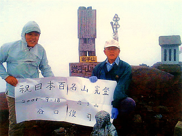 2001年9月18日、天候薄曇り、しかし頂上を望むと雲がかかり「南部冨士」と呼ばれる東北岩手県盛岡の北に聾える2039mの雄姿は見えない。盟友井上一氏のサポート役で一気に八合目まで登ると、一面ガスがかかり強烈な風に見舞われて山の女神は最後まで試練を与えてくれた。遂に岩手山の頂上に立ち歓喜の雄叫びを挙げ銘酒で乾杯!遂にやった登った登り終えた。百の頂きに立った!65才の老爺も今までの汗と涙の苦闘も忘れて興奮し、大感激の一時でした。バンザイ! 万歳 万歳♪♪♪