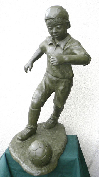 孫が幼稚園でサッカー教室へ入り、そのチームが大阪代表となり、東京で開催される園児のサッカー大会へ出場しました。その時の内容が毎日新聞に掲載され、偶然孫が写真の中央に写っており、そのポーズが大変ダイナミックで面白いと感じましたので、作品にすることにしました。倒れそうな不安定なポーズと園児の筋肉でのダイナミックな表現に工夫をしました。この作品は先生のお許しがでたため、全関西美術展に応募し入選させていただき、大阪市立美術館の本会場に展示していただきました。 |