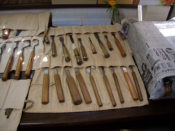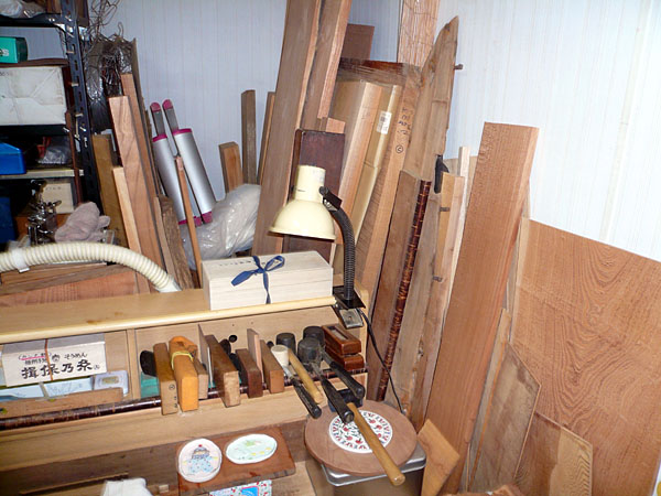 久米さんは前出の人間国宝”村山 明”先生の一門として創作活動を続けられ、その創作活動の場は、自宅裏の離れにある作業場”木工芸・工房「信」”であり、木工に関する日本古来の技法、鑿(のみ)、鉋(かんな)、彫刻刀(ちょうこくとう)などを使い、日々創作に取り組んでおられます。木工芸の技法としては、以下のものがあります。