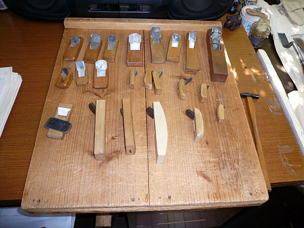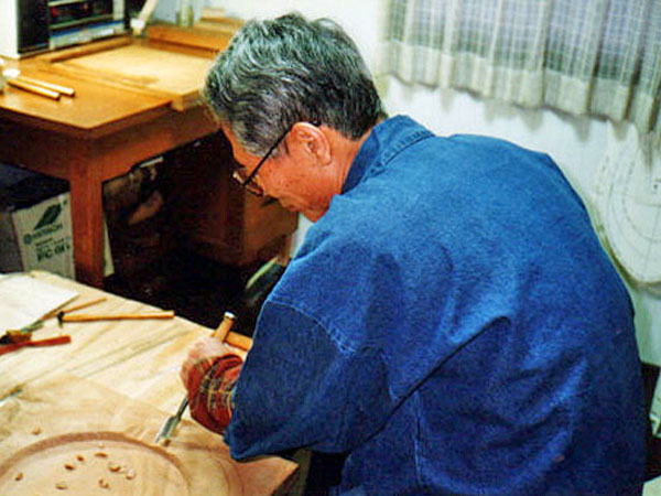 ここで師と仰ぐ人間国宝”村山 明”先生とお会いすることになりました。教室での村山先生の指導の下では、最初3ヶ月間ぐらいは砥石で鑿(のみ)を研ぐ作業に終始、日々の単純作業が嫌でたまらず、今日も同じ作業なら止めようと思って出かけた日に、木の削り作業を許され、何とか続けられたのが本音だそうです。 その削り作業を続けるうちに、その難しさ、木の変化と複雑さに、次第に木独特のぬくもりを感じる様になり、更には日本古来の伝統技法のおもしろさに親しみと喜びが感じられ、その魅力に魅せられて、この道に深く入って行くことになったそうです。