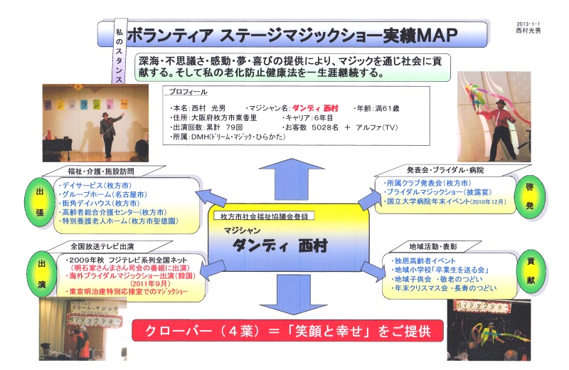 - マジックは、笑顔と幸せを提供できるもので、「笑いの療法士」=「ダンディ西村」を目指す。