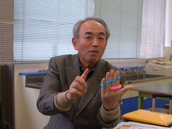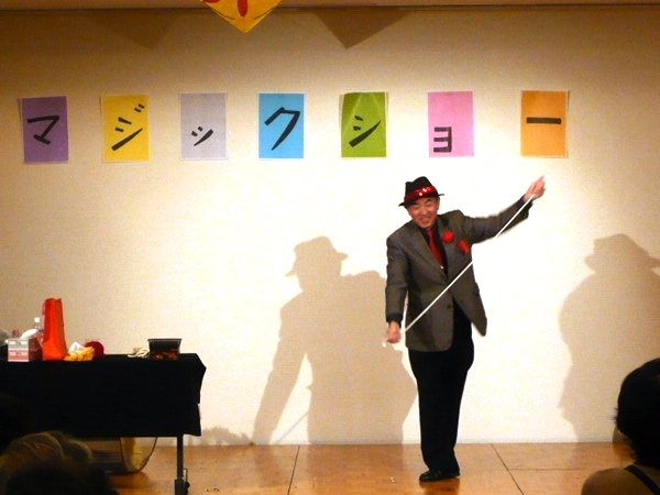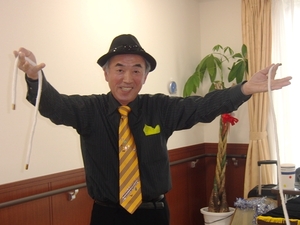 師走も半ばの午後、マジシャン「ダンディ西村」氏は、取材会場の南部市民センター(ユーカリ)に大きなバッグを持って現れた。「何が入っているのですか」 「一寸後で…」からインタビューが始まる。「何かマジックでも見せてもらえるのでは‥」の期待に応えて、取材開始早々に楽しいトークを交えながら、先ずは簡単なマジック(写真右)が始まる。