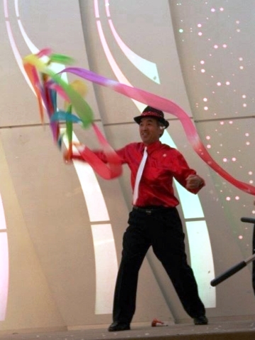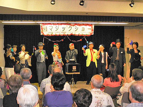 氏の過去5年間の活動の一端を写真で紹介するが、これまで約80回出場し、お客様の動員数は5,000名以上ということである。当初も現在も福祉施設の慰問等は多いが、 現在はさらに全国放送のテレビや海外でのブライダルマジックショーにも出演されている。
