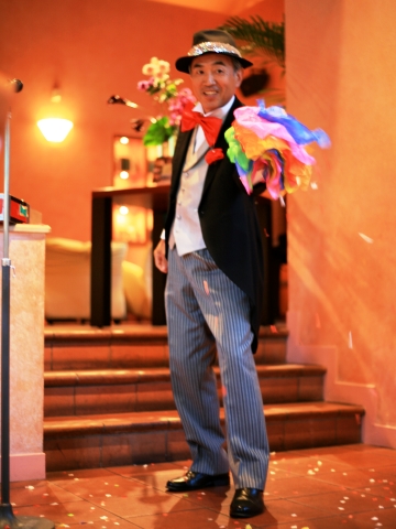 マジックについては、小学校時代からトランプマジック(テーブルマジック)に関心を持たれていたが、現在はステージマジックを楽しまれており、「ドリームマジックひらかた」(略称:DMH)という地域マジッククラブに属し、リーダ的立場で年間30回の舞台を踏むまでになられている。とにかく今「夢中」という雰囲気が、強烈に伝わってくる方である。