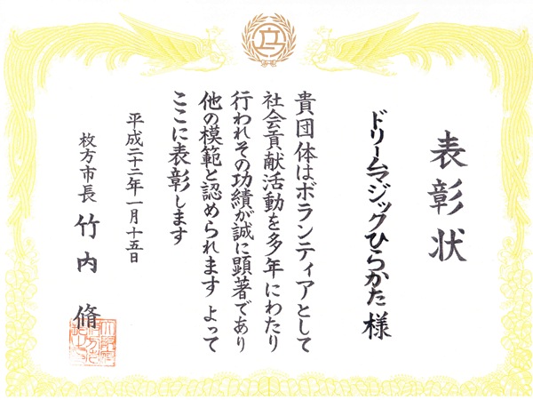 現在は枚方市社会福祉協議会に登録し、仕事もしながら、前述の「ドリームマジックひらかた」のメンバーの一人として、ボランティアマジックショーに年間30回程度出演され、クラブでは月2回2時間の勉強会を実施し研鑽に勤められている。すぐに演じられるレパートリーも、50種以上お持ちである。