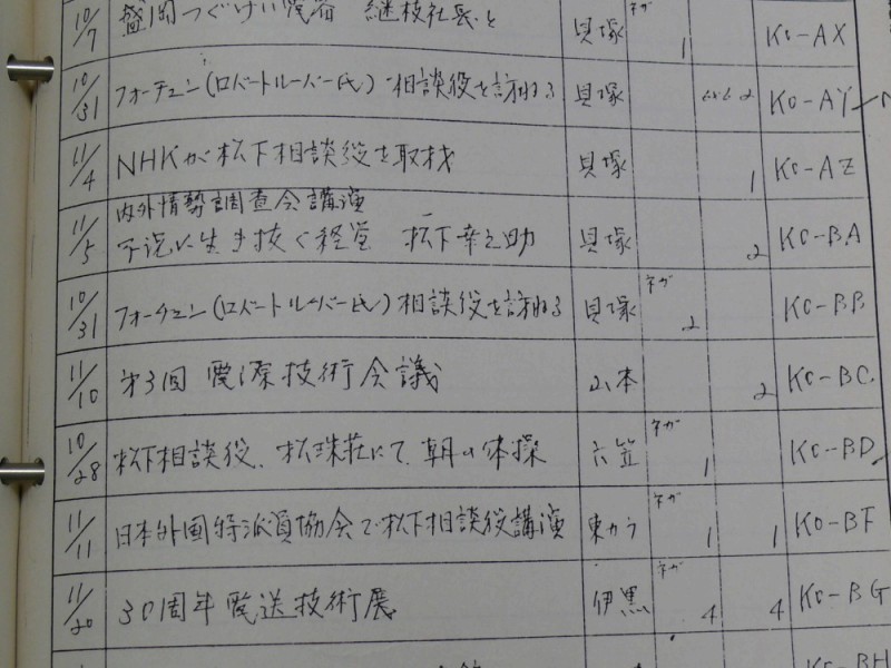 今も社史室に大切に保管されている。現在も関連部門から問合せの連絡が来るようだ。A4記録紙500枚に迫る記録である。日付、場所、撮影の内容、撮影者等の記録である。(写真参照)