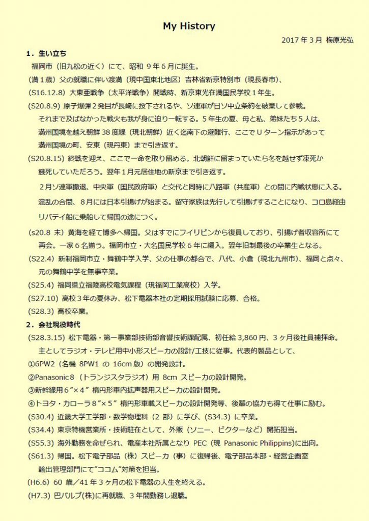 梅原さんは福岡県出身、1934年(昭和9年)生まれの82才。県立福陵高校電気課程(現:福岡工業高校)を卒業され、1953年(昭和28年)松下電器入社。第一事業部(後のラジオ)技術部へ配属されスピーカユニットの設計他を担当、1994年4月に定年退職。 <出身歴・学歴・職歴等の詳細は、ここをクリック>