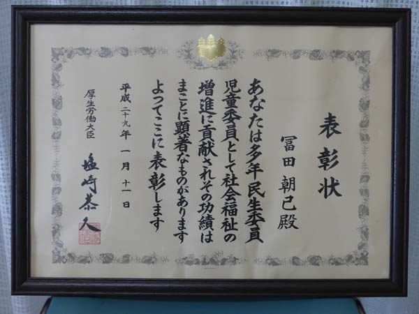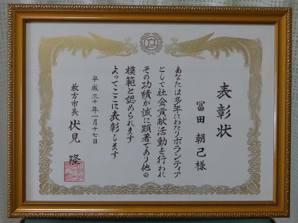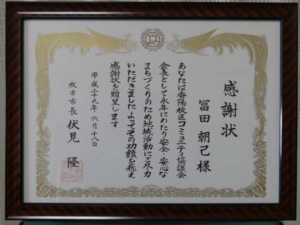 など、行政、学校、PTAを巻き込んだ活動を行い、2007年(平成19年)には、香陽コミュニティ協議会会長として、ますます活発化させた。それら長年の功績により、2017年(平成29年)には、塩崎厚労大臣より「民生委員永年活動特別表彰」を授与され、続けて2018年(平成30年)には枚方市長より「永年ボランティア活動」に対し表彰される。2017年(平成29年)には後進に道を譲り、顧問として指導を継続中。