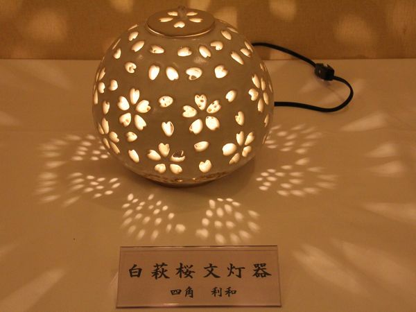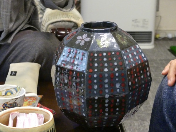 松心会館にも会員皆様の力作を展示されている。(四角さんの作品:3D CAD(SketchUP)を駆使して作陶した白赤文八角花器)