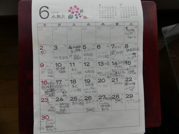 諸谷夢中人の2019年6月、7月のカレンダーを見せていただきました。予定の無いのは月1日程度。同一日に複数の 予定が入っているのも日常的な印象を受けます。具体的な7月の予定を見ると、大阪府高齢者大学校(高大)講義5回、高大コーラス4回、 松愛会3回(宝塚歌劇観劇、カラオケ同好会、夢中人取材)、ハングル講習会4回(含予習)、教会日曜礼拝3回、 合唱団:大阪シンフォニック クヮイア(OSC) 練習他6回、ボランティア(介助他、慰問)5回、囲碁同好会1回、他・・・。 毎月このようなスケジュールです。それでは、夢中人の活動内容を垣間見ることにしましょう。