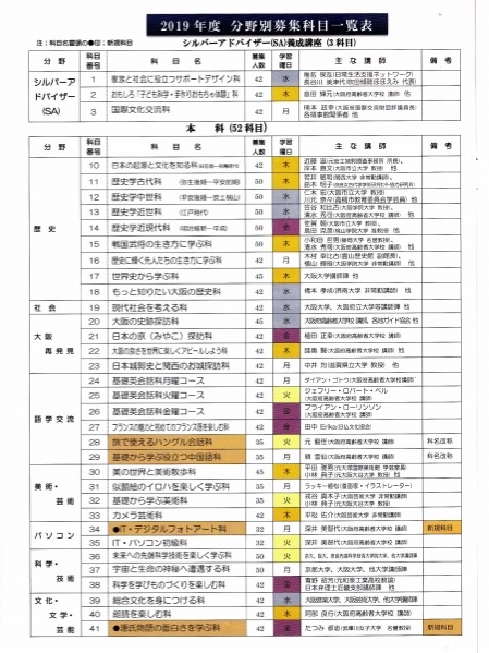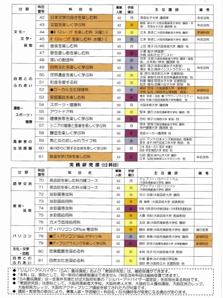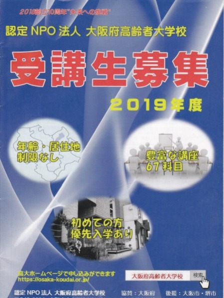 大阪府高齢者大学(以下高大と記載)は、平成21年度にシニア世代の有志が立ち上げた生涯学習機関で認定NPO法人です。 シニア学生2700名を超える受講生を抱えた全国屈指のマンモス校です。学習コースは67科目用意され加えて200名のボランティアが運営を支えています。受講生から始まり自ら徐々に運営に関わっていくスタイルで運営されています。 基本方針は、①学習する ②仲間づくり ③健康づくり からなり併せて社会参加活動を積極的に促進しています。 具体的なコースでは、・歴史を学ぶ ・語学 ・芸術 ・音楽 ・科学技術 ・文化芸能 ・スポーツ ・生活課題 等の中に更にコースが 設けられています。