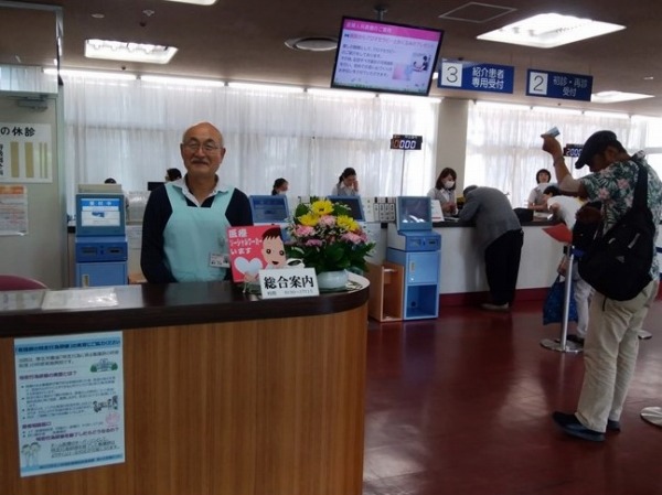 現在、枚方市の星ヶ丘医療センターで受付をやっています。奥様が体調を崩されて星ヶ丘医療センターにお世話になりました。この時病院を訪れると高齢の方が受付できずに 困っていました。最近の病院は、コンピュータ化が進み患者自身が操作しなくてはなりません。高齢の方は戸惑っています。また車椅子の補助や介助を必要とされている 患者さんも沢山おられます。加えて日本語が解からない、話せない方も来院されます。