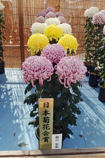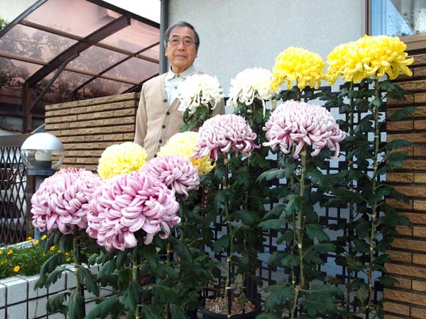 菊づくりは個人的な匠の世界で、他人に伝承することが少ない。長年にわたり枚方の天気・温度など気象との関係のデータをとり、植物生育との関係を極め、数々の展示会へ出展するまでになった。以前は、全国大会、大阪府大会に出展していたが、今は枚方菊花展が主体である。(下記は最近の受賞作品の一部)