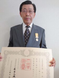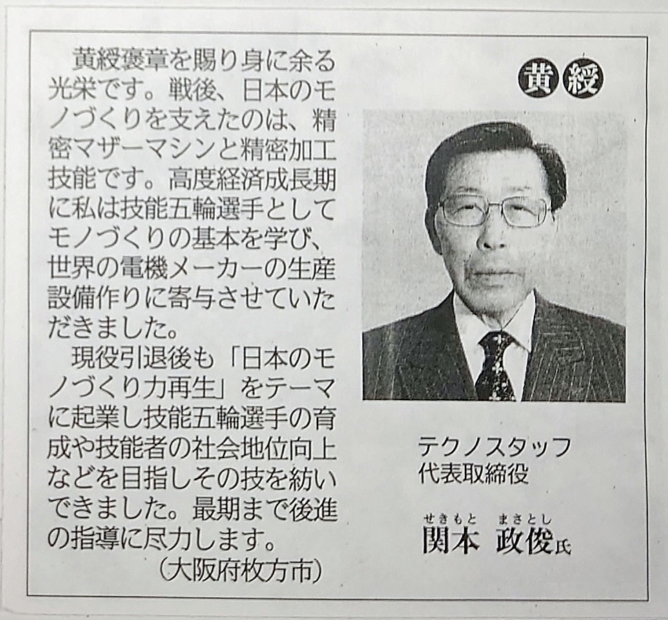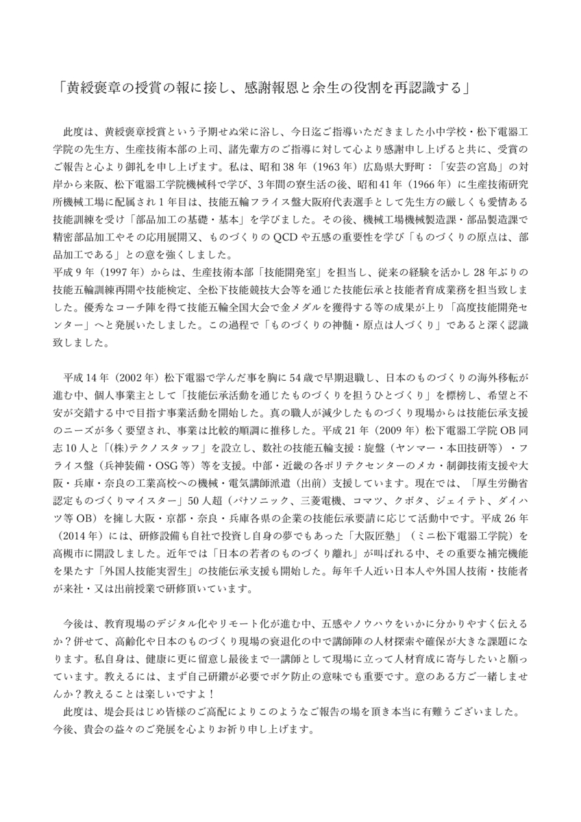 他にも種々受賞者はたくさんおられることと存じます。幸之助創業者に憧れて工学院に入学させていただき、技能五輪教育に始まり好きな仕事で鍛錬を受け、更に卒業後も社会生活でその能力を多少なりとも生かしながらその功績で平成4年春に「黄綬褒章」まで頂いたことは、本当に松下電器に奉公させて頂いた賜物です。先生や先輩の皆様に幾ら感謝申し上げても感謝し切れません。今後も「感謝報恩の精神」を忘れずに何事にも精進して参る所存です。
