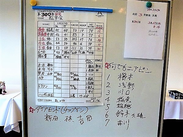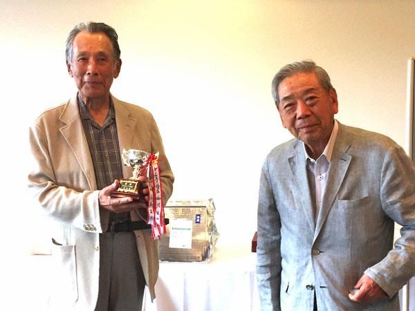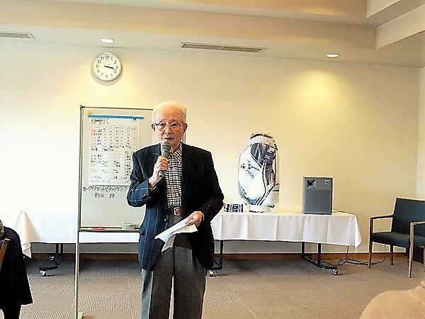 プレー終了後の表彰式は、新田代表幹事からあいさつがあり、次に松市会創設者の一人の吉田和也さんから『随想 松市会 300回を迎えて(原文のまま掲載)』というこの300回をお祝いをするお話がありました。今年で90歳を迎える吉田さんですが、この日のプレーでもお元気に頑張られ、5位に入賞されました。優勝は稲尾修二さんで豪華記念景品を獲得されました。