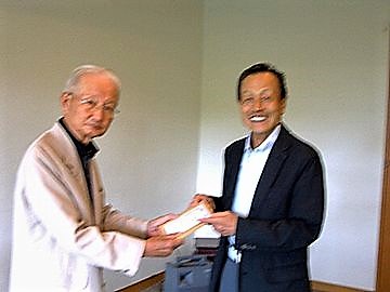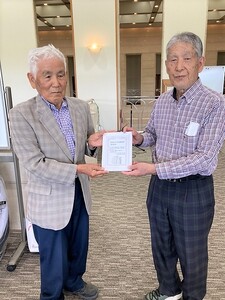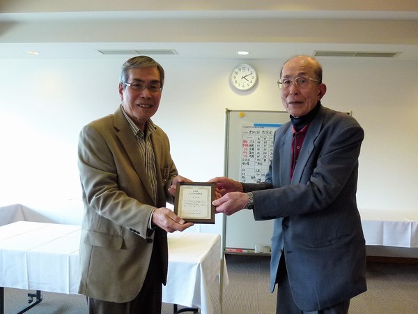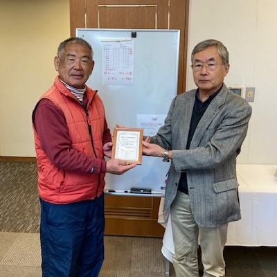 2024年12月度例会で、小髙省三さん(写真:左)が松市会出場100回を達成されましたので、盾をお贈りし、お祝いしました。松市会40人目の達成です。