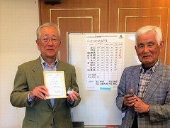 2015年7月度例会で、鬼頭敏夫さんと林 久直さんが、松市会出場200回を達成されました。鬼頭敏夫さんは1993年10月の初参加で、今回は優勝との「W受賞」で優勝回数は6回となりました。林 久直さんは1994年11月の初参加で、優勝回数は4回となりました。