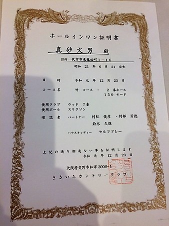 - きさいちCCホールインワン証明書