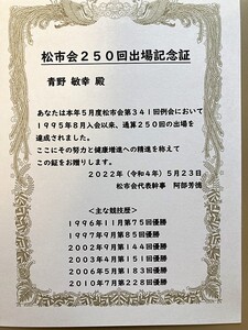 2020年4月に青野 敏幸さんが松市会出場 250回達成!
