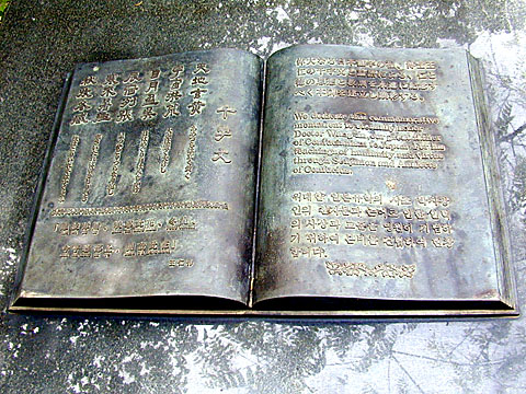伝王仁の墓は、枚方市藤阪の住宅街の一角にあり、丸い墓石や「博士王仁墓」と刻まれた墓碑のまわりを200本余りのムクゲが植えられています。ムクゲは夏から秋まで長く咲き続ける花で原産地は中国ですが、韓国では「無窮花(ムグンファ)」と呼ばれて愛され、日本の植民地支配下でも民族のシンボルの花とされてきました。墓の南側には朱塗りの柱と瓦が百済の雰囲気を漂わせる休憩所があります。ここには王仁の生地という韓国南西部・全羅南道霊岩郡の王仁廟の写真などを展示し、毎年4月に開かれる「王仁文化祝祭」の様子も紹介されています。