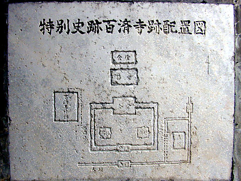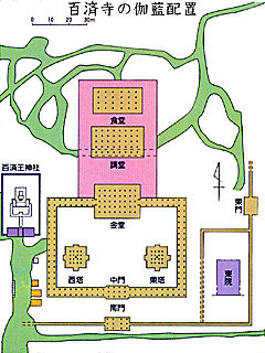 百済寺は発掘調査の結果、奈良の薬師寺のように金堂の前に東西二つの塔を持つ「二塔一金堂」の伽藍(がらん)配置で新羅の感恩寺に類似していると言われています。南から北へ南門・中門・金堂・講堂と位置を占め、金堂の前方東西に相対して東塔・西塔が配置されています。