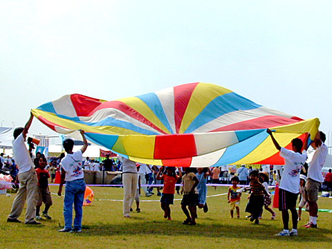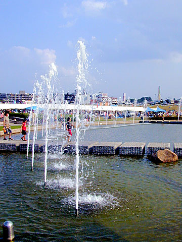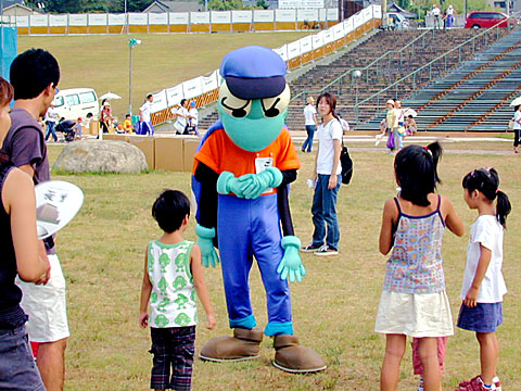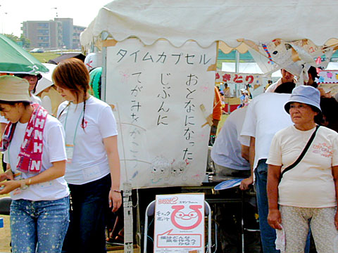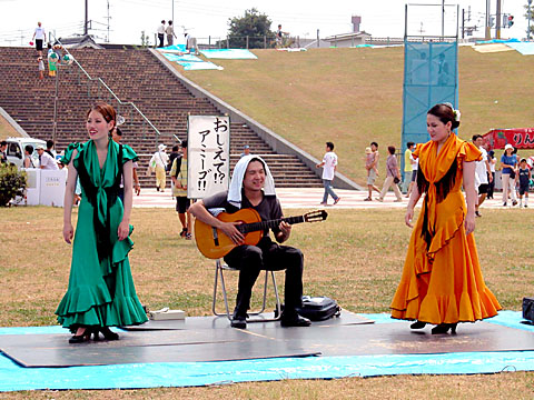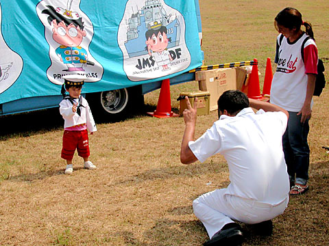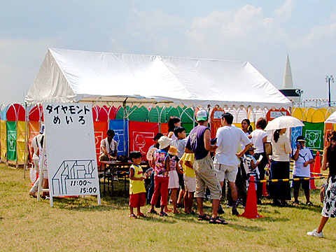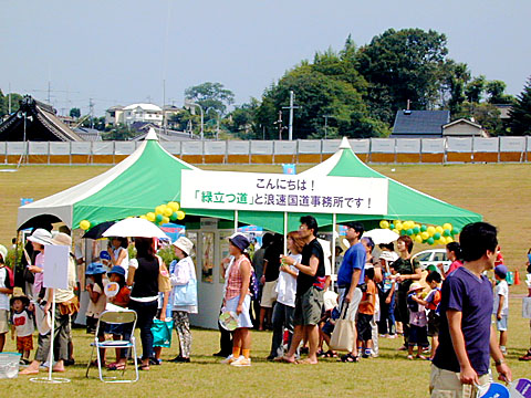 周辺の芝生広場では、大学生のクラブが自分たちの活動を披露する場所「教えて!? アミーゴ!! 」があり自分たちの大学をPRしていました。海上自衛隊の制服や帽子を子どもに着せて写真をとり、自衛隊の堅いイメージが無く、楽しく頼もしい人たちの集団として海上自衛隊が広報活動をしていたり、浪速国道事務所が「緑立つ道」の広報をしていました。