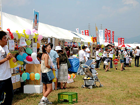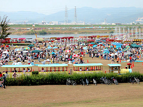 水辺公園で開催された市民祭は、今年は初めて開催された「夢・くらわんか踊参来(よさこい)大会」をはじめ、「忍風戦隊」ハリケンジャーショー、まつりトレイン、ミュージックフェスティバル、フリーマーケットなど数々のイベントにたくさんの人が詰めかけた。実行委員会の出店は300店舗を越え広い公園を三重に取り囲んでいた。