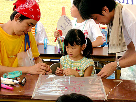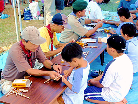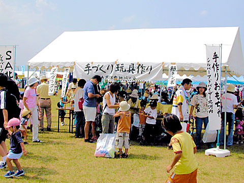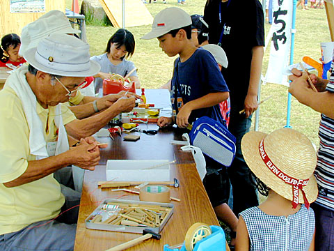 またローターアクトクラブの皆さんが凧作りを教えてくれる「凧作ってあーそぼ」、ボーイスカウト連盟の皆さんが教えてくれる「森の教室」、SA(シルバーアドバイザー)北河内の皆さんが、木を使った玩具など素朴な遊び道具作りを教えてくれていました。