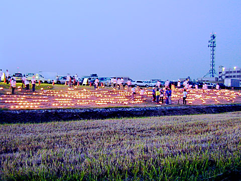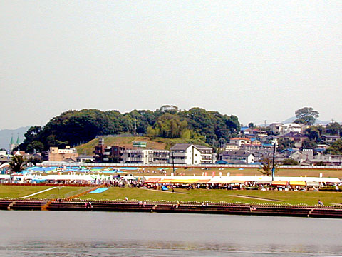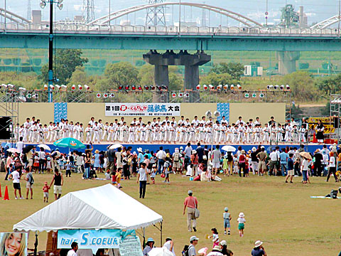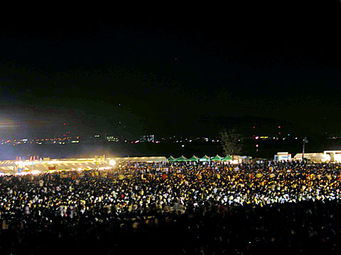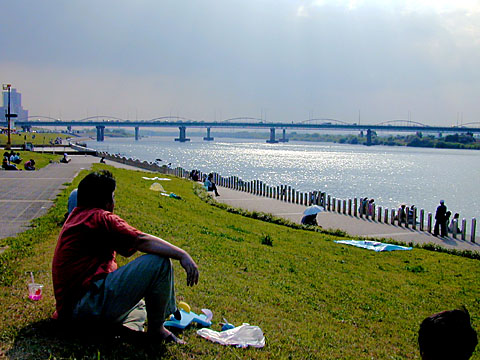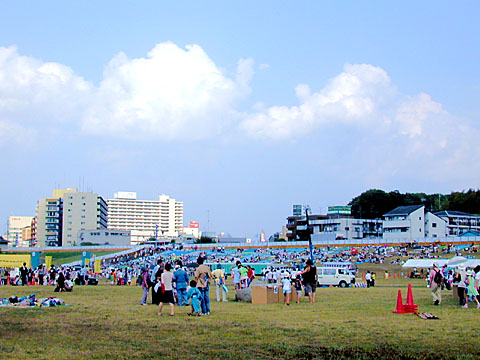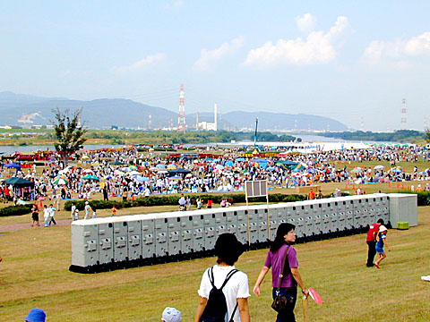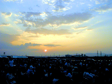 枚方大橋に見事な夕日が落ちる頃、会場は超満員に、いよいよメインイベントの「くらわんか花火大会」の開演が近付き観客が集まり始めた。会場は昼間の猛暑とはうって変わって水面を渡る川風が心地よい。
