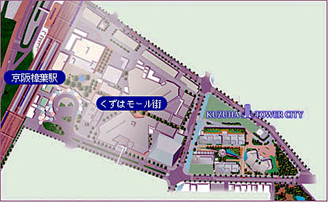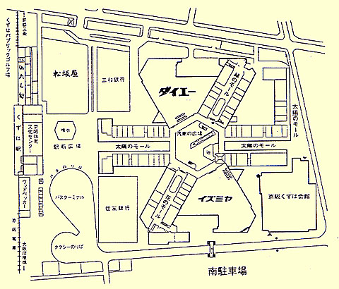 日本で初の広域型の公園風のショッピングセンターを建設し、「くずはモール街」と命名してS47年4月に開業した。下図に示すように、デパート(松坂屋)とスーパ(ダイエー、イズミヤ)を核として70店の専門店と銀行などを有機的に組み合わせ、1,500台以上の駐車場を備えた本格的広域型ショッピングセンターを建設した。