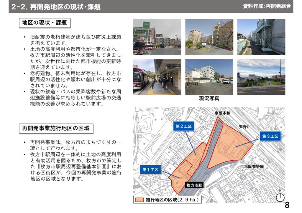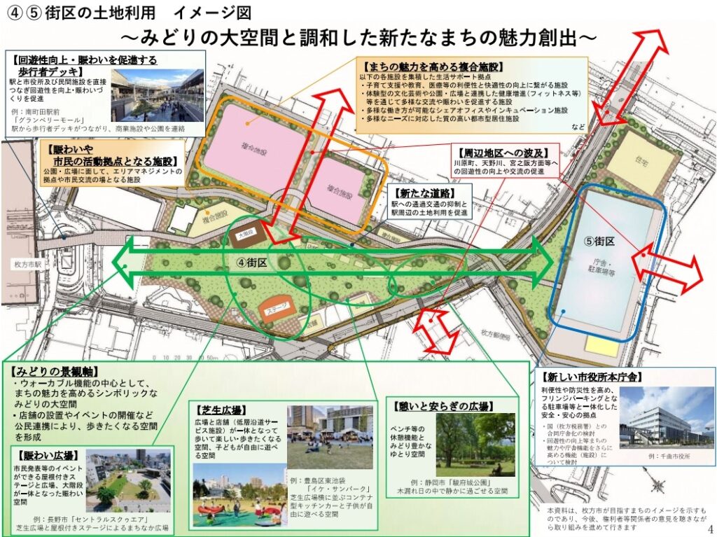 枚方市駅周辺は、東海道の宿場町として栄えた歴史があり、昭和30年代の大阪府住宅供給公社枚方団地や市役所本館の建設、40年代からの駅前の市街地再開発事業や京阪本線連続立体交差事業の完成等を経て、都市基盤が形成され、現在は40万人都市の中心市街地としてその役割を担っていますが、昭和30年代からベッドタウンとして栄えてきましたが、人口は 2009年(平成21年)をピークに微減傾向が続いています。