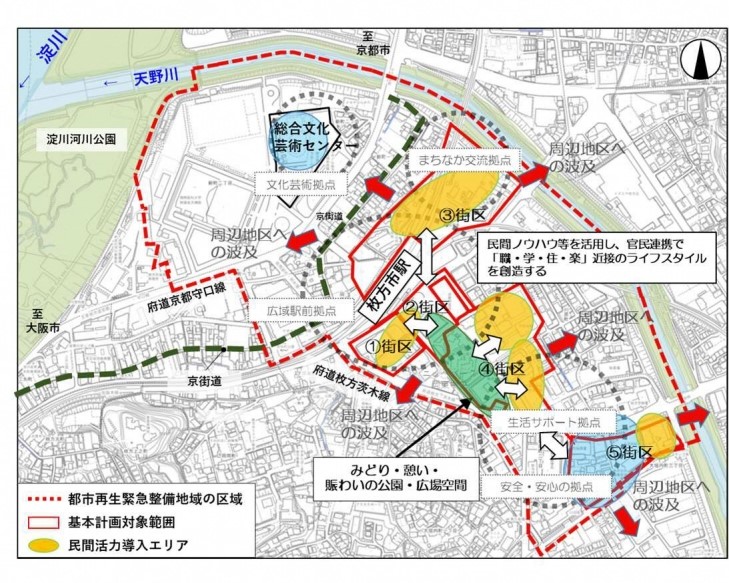 現在、枚方市駅は、京阪本線と交野線の結節駅で特急停車駅でもあり、大阪、京都への良好なアクセスが確保されています。そのため、京橋駅、淀屋橋駅に次ぎ 3 番目に多い乗降客数(約 9.5 万人)となっており、枚方市駅を中心に、西に淀川、北から東にかけて天野川などの豊かな自然環境や、東海道56番目の宿場町として栄えた京街道があります。枚方市駅の南側は市庁舎をはじめとした行政機能が集積したエリアであるほか、枚方市駅周辺には、商業・医療・文化交流などの機能が集積しています。