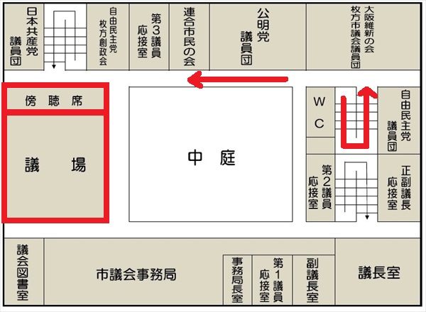 「枚方市議会議場」は、枚方市役所 本館の4階です。本館を4階まで上がると、「大阪維新の会 枚方市議会議員団・控室」が見えてきました。そこで左折し、まっすぐ進むと「傍聴席・入口」が見えてきます。「入口」手前にある「受付簿」に「氏名・住所」を記載し、備え付けの箱に入れ、傍聴席・入口から入場しました。