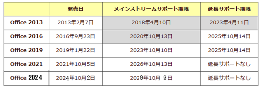 Officeの種類とサポート期限の一覧表が下表です。ここではサポートの終了後のOfficeの扱いの考え方をまとめることにします。Microsoft社はサポート終了が近いOffice2016、2019を使っている場合は、サブスク型のMicrosoft365への移行を薦めています。2024年10月2日に発売したOffice2024に移行する方法もあるようですが、少しづつサポート期間が短くなっています。また、注意しながら古いものを使い続ける、Web版のMicrosoft365に移行するなどの方法もあります。