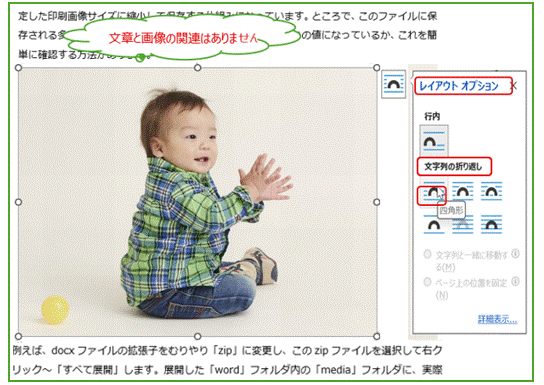 さて、Word文書中の画像の大きさや配置を変えるには、画像特有の操作が必要になります。下図に示すようにマウスでその画像を選択すると「レイアウトオプション」が表示されるので、「文字列の折り返し」を「四角形」にします。これで画像の大きさや配置を、マウスで任意に調整できるようになります。
