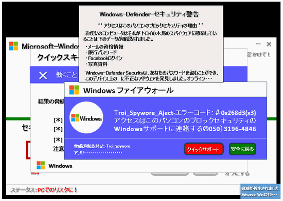 ホームページを見るソフト(ブラウザ)を操作していると、その画面に「Windows Defender セキュリティ警告」「トロイの木馬のウイルスに感染しました」のようなメッセージが出ます。