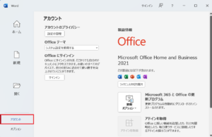 Officeのバージョンを確認するには、Officeアプリ(Word、Excelなど)を起動して、ホームまたはファイルのメニューから「アカウント」をクリックすると、「製品情報」の下に「バージョン情報」が表示されています。