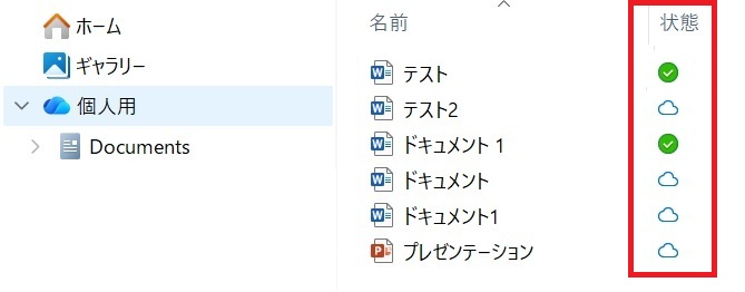 OneDrive内のファイル表示の例です。「緑地のチェック」と「雲マーク」の状態を示しています。