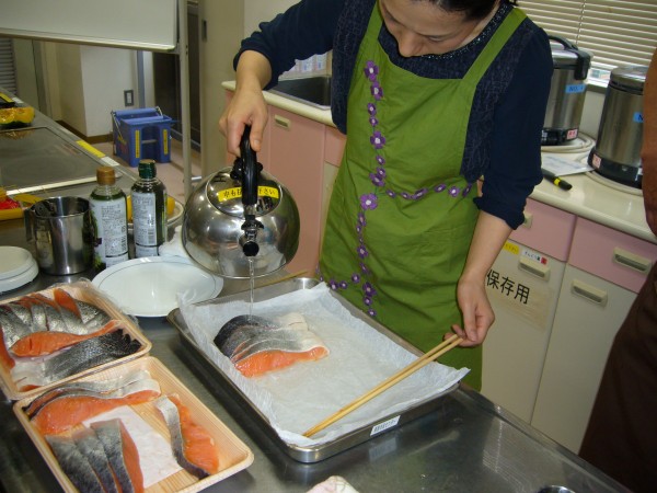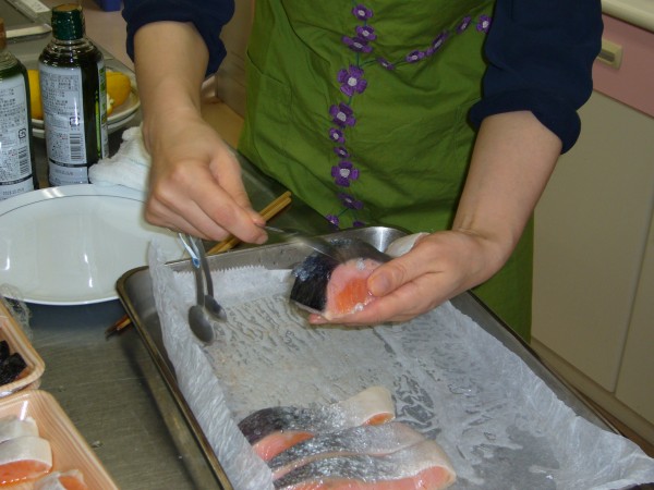 - 鮭の鱗は熱湯を掛けて、スプーンで削ぎ取る